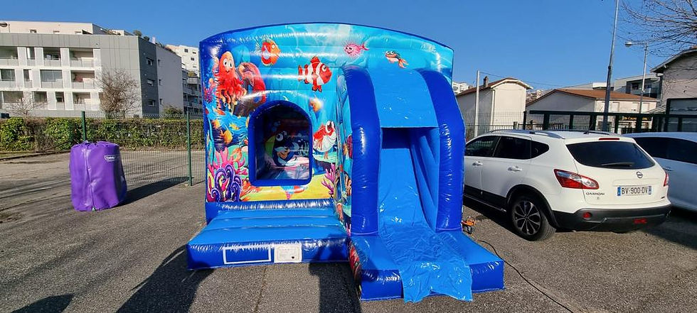 La location comprend : moteur soufflerie qui fonctionne avec une prise électrique classique + bâche protection de sol + piquets de sécurité pour la fixer et lester au sol + balles multicolores pour plus de fun !